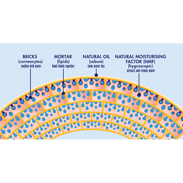 In healthy skin the ‘bricks’ are full of water and fit tightly together with no gaps between them. The ‘bricks’ themselves contain Natural Moisturising Factor (NMF) which attracts and keeps in water.